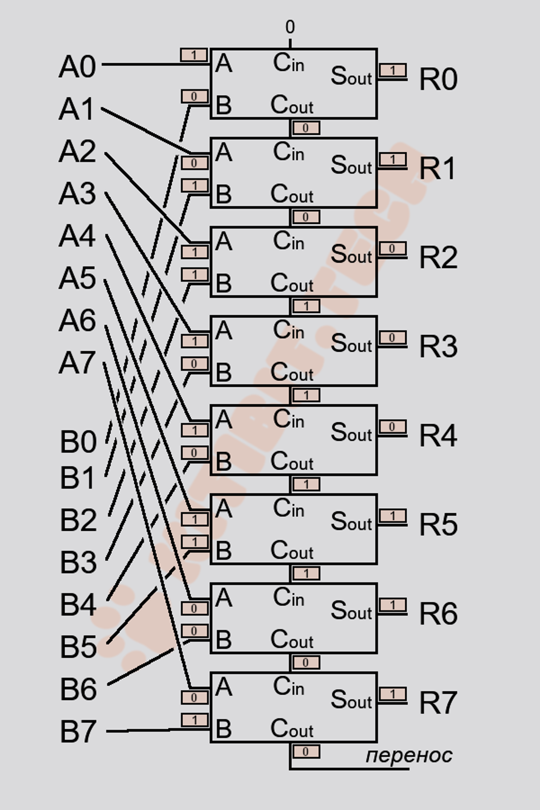 Для 8-бітного беззнакового числа існує лише 256 можливих значень, які знаходяться в діапазоні від 0 до 255. Коли ми додаємо два 8-бітних числа, сума може бути будь-яким числом від 0 до 510, що є 9-бітним числом. Дев'ятим бітом тут виступає перенос останнього суматора, який по суті означає переповнення - значення результату виходить за межі 8-бітного числа. На схемі вище наведено приклад додавання двох чисел, перенос буде 0: