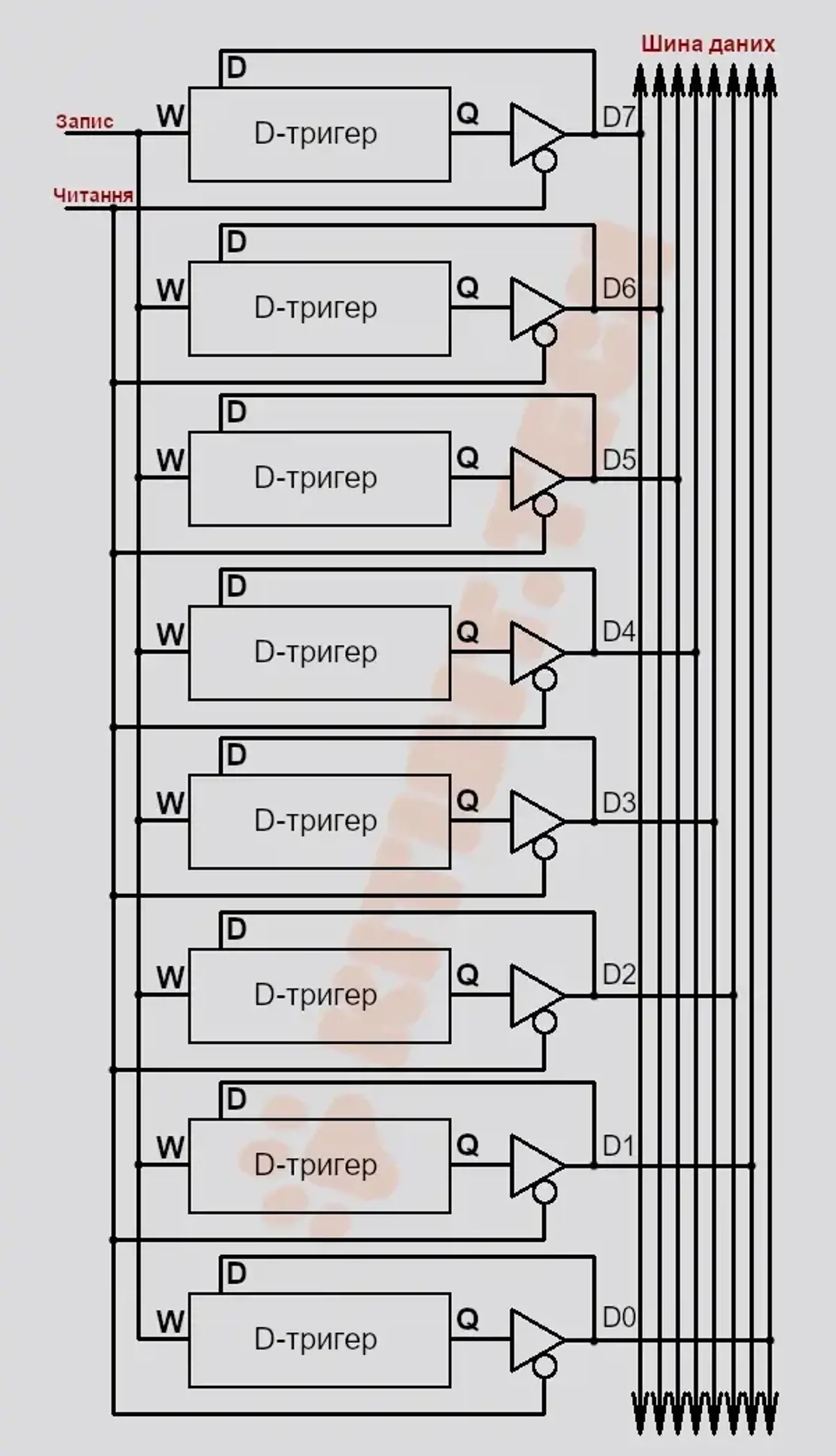 Можна побудувати 8-бітний запам'ятовуючий елемент шляхом комбінування 8 тригерів. Цей базовий запам'ятовуючий елемент називається регістром.