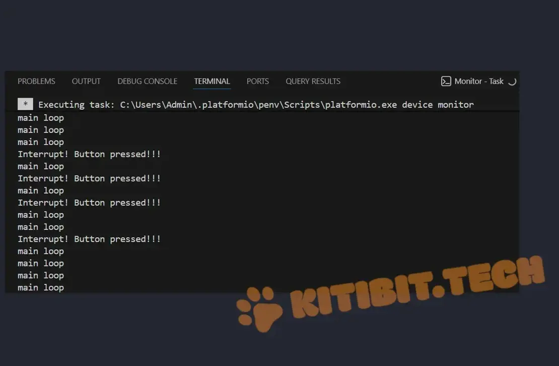 На зображеннях вище представлено зібрану на Arduino Nano схему в роботі, і вивід в Serial Monitor. Кожну секунду в консоль виводиться текст "main loop" з основного циклу програми, а при натисканні на кнопку виводиться текст "Interrupt! Button pressed!!!". Важливим є тут те, що вивід тексту при натисканні кнопки є миттєвим - навіть якщо натискання відбулось в момент виконання команди delay(1000) - затримки не буде!