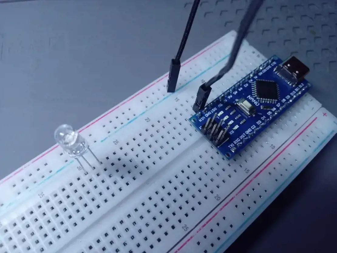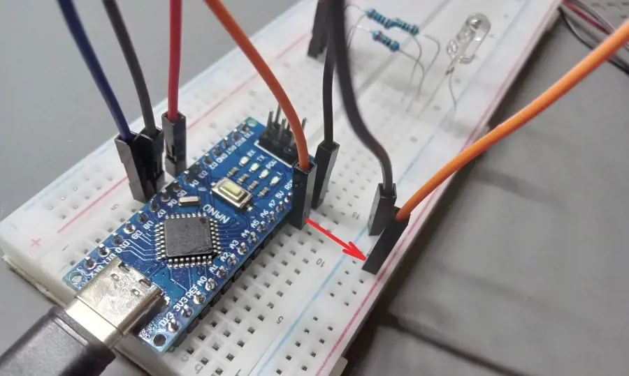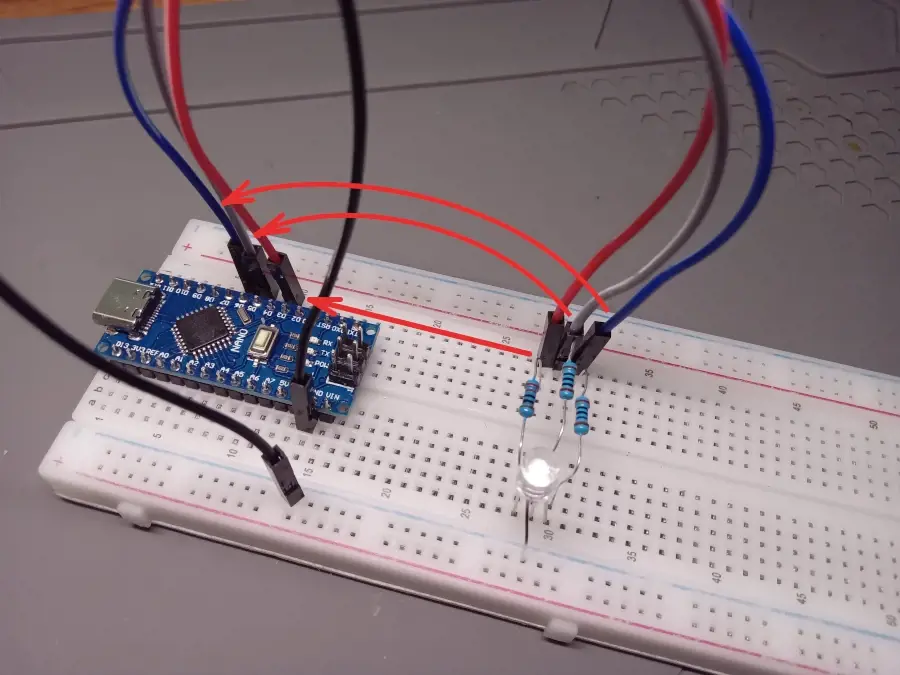 Отже, встановлюю світлодіод на плату таким чином щоб катод був на "-" шині макетної плати, а аноди окремо один від одного. Одразу підключаю "-" шину до виводу GND Arduino-плати: