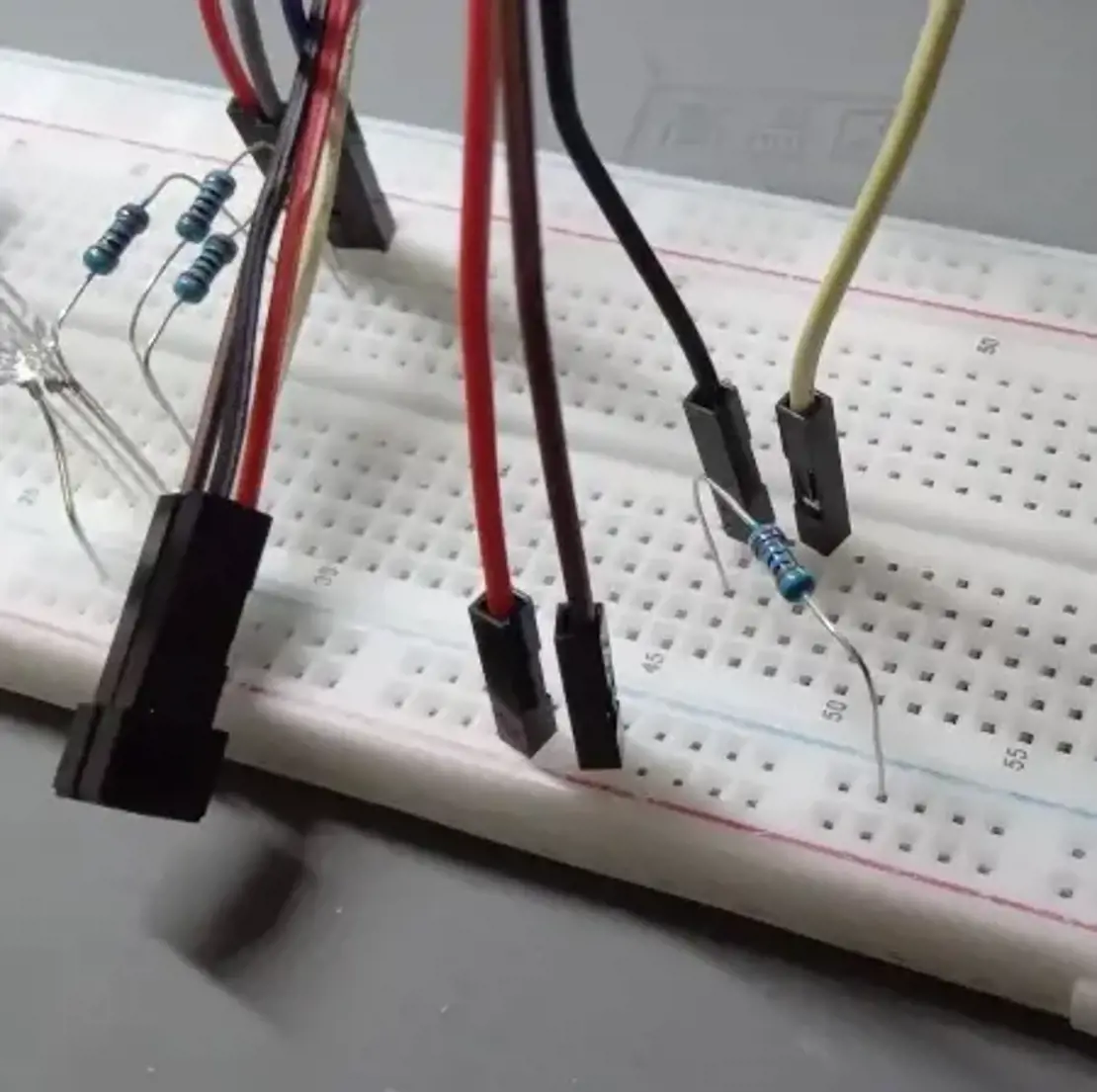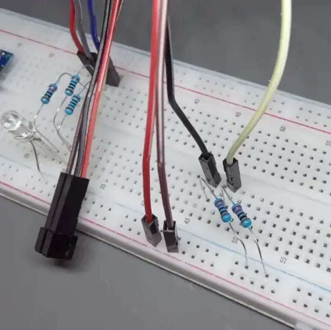 Підключаємо до плати: емітер і анод до "+" шини, а катод і колектор на окремі шинки для підключення резисторів: