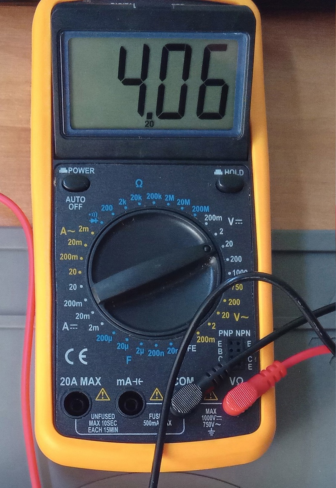 Мультиметри бувають дуже різні, але загальні принципи однакові. Є декілька виводів, один з них підписано як COM - це мінус, він підключається для всіх режимів. Є декілька плюсів - один з них основний, підписується якось типу VAΩ (саме він нам потрібний). Коли щупи підключені до відповідних виводів, на перемикачі вибирається режим та межа вимірювання (діапазон). Наприклад, на даному приладі для заміру напруги акумулятора 3,7В (постійний струм) треба переключити на режим V⎓, межа - 20 (так, як зображено на світлині).