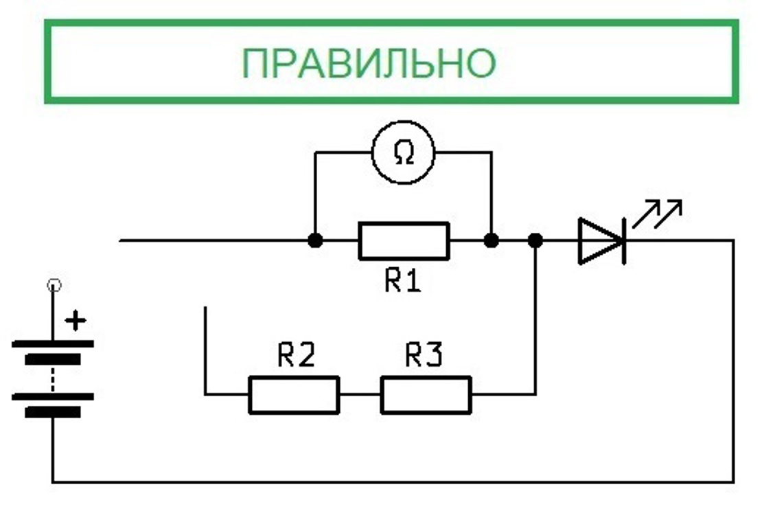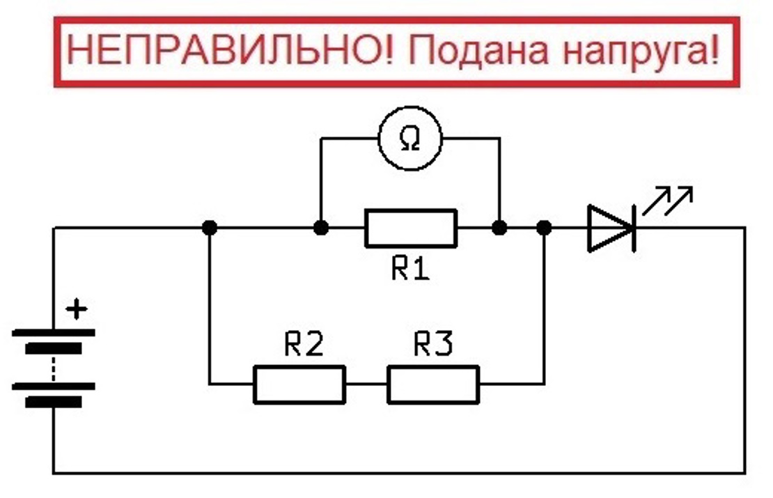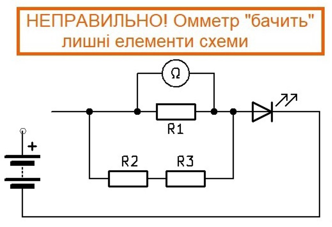 Омметр використовується для вимірювання електричного опору провідників, елементів та ланцюгів. Він допомагає визначити цілісність провідника, відповідність його до опору до вказаного на корпусі, або виявити обрив. Перед вимірюванням схема знеструмлюється (ОБОВ'ЯЗКОВО! Інакше прилад можна пошкодити!). Омметр підключається до виводів пристрою, або до ділянки схеми, опір яких потрібно виміряти. При цьому треба враховувати, що омметр - пристрій активний (подає деяку невелику напругу на схему), а отже треба забезпечити протікання вимірювального струму лише по тій ділянці схеми, яку необхідно заміряти. На схемах омметр зображається як кружечок з літерою Ω (омега). На схемах нижче представлено приклади заміру опору резистора R1. На першому не відключено живлення схеми - це може призвести до виходу з ладу омметру і чутливих елементів схеми. На другому живлення відключено, але вимірювальний струм омметра буде протікати не тільки через R1, а також через паралельну гілку з резисторами R2-R3 (показання приладу будуть невірні).