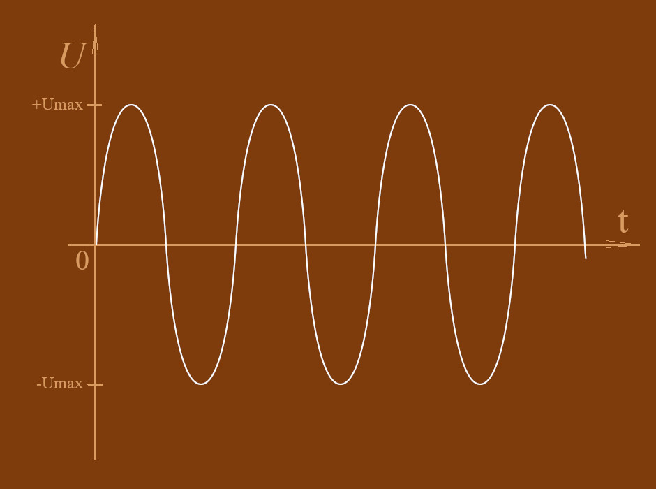 Змінний струм – це електричний струм, сила і напрям якого періодично змінюються в часі під дією змінної напруги. Кількість змін за секунду називається частотою і вимірюється в герцах (Гц). У побутових розетках ми маємо саме змінну напругу, що має синусоїдальну форму з частотою 50 Гц. На рисунку нижче зображено графік, на якому видно як змінюється напруга (вісь U) з пливом часу (вісь t):