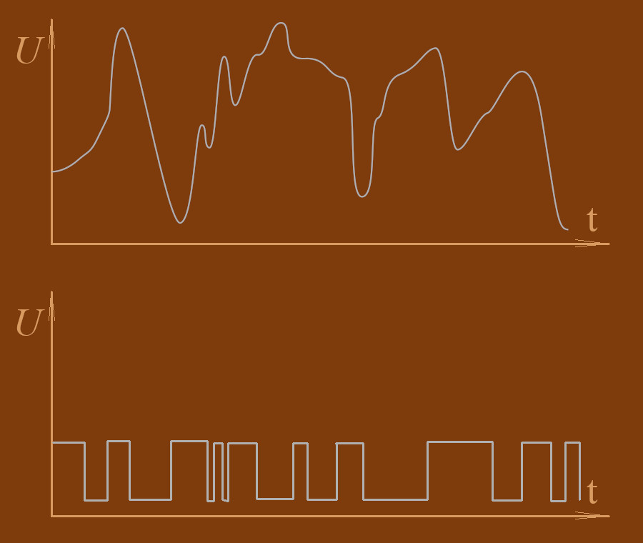 Як видно, цифровий сигнал змінює напругу стрибкоподібно. Там де напруга вища вважається 1, нижча - 0.