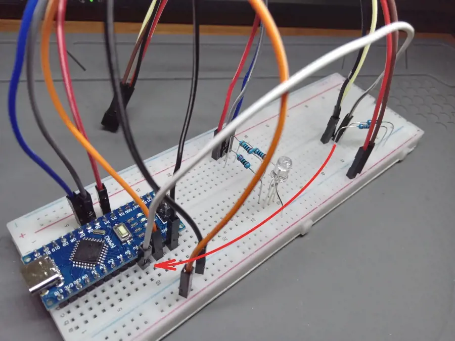 Тепер потрібно під'єднати вихід фототранзистора з ADC входом плати мікроконтролера. Згідно схеми виводимо дріт між резистором 10к і білим проводом (колектор транзистора), і підводимо його до найближчого (або найзручнішого) аналоговому піну плати (в моєму випадку це A6):