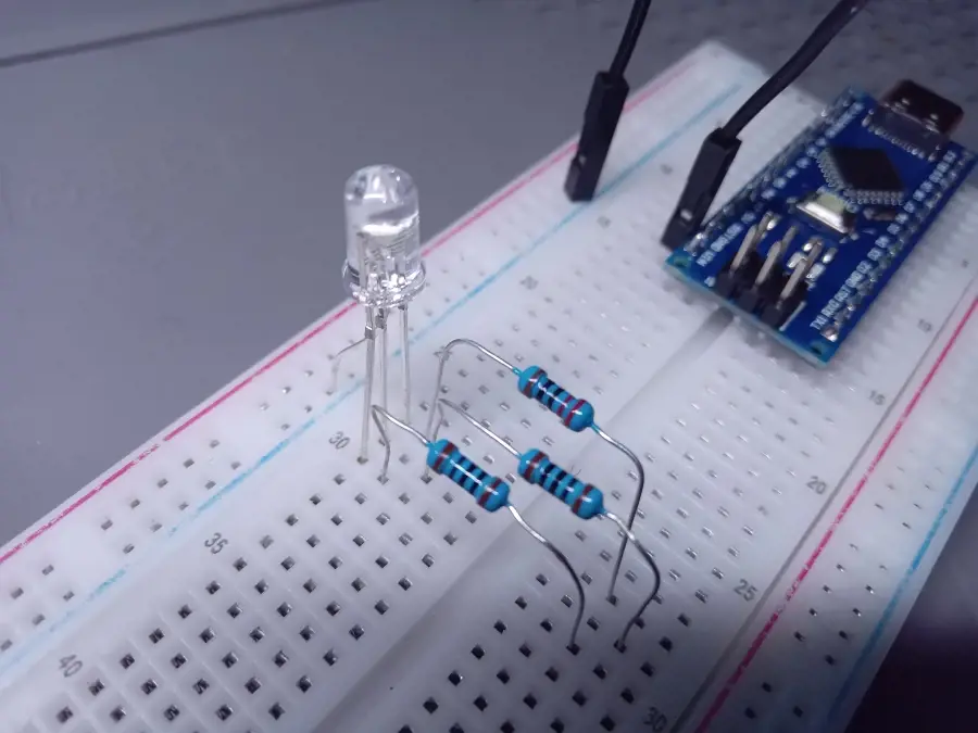 У моєму випадку, напруга червоного діода менша за напруги інших, тому резистор з більшим опором, але пристрої можуть відрізнятись - дивіться документацію конкретного приладу.