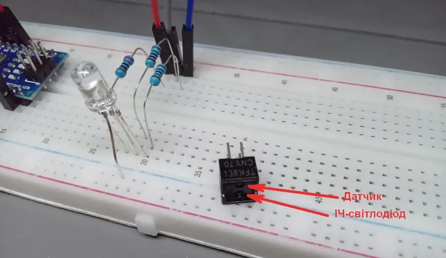 Чудово! Наша індикація працює, але в нас ще є робота. Тепер треба підключити датчик перешкод, який при наближенні до поверхні що відбиває світло передає інформацію про відстань до цього об'єкта на мікроконтролер. Для цього підійде CNY70.