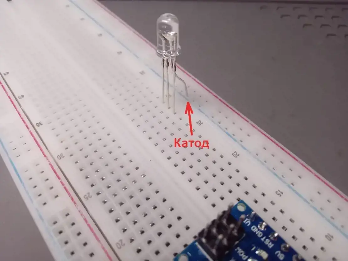 Для початку зберемо схему індикації. Для цього візьмемо RGB-світлодіод, такий світлодіод має в одному корпусі 3 діоди різних кольорів: червоний (R), зелений (G), синій (B). Вони мають 4 виводи - один з них загальний катод (самий довгий), інші - аноди кожного окремого діода.