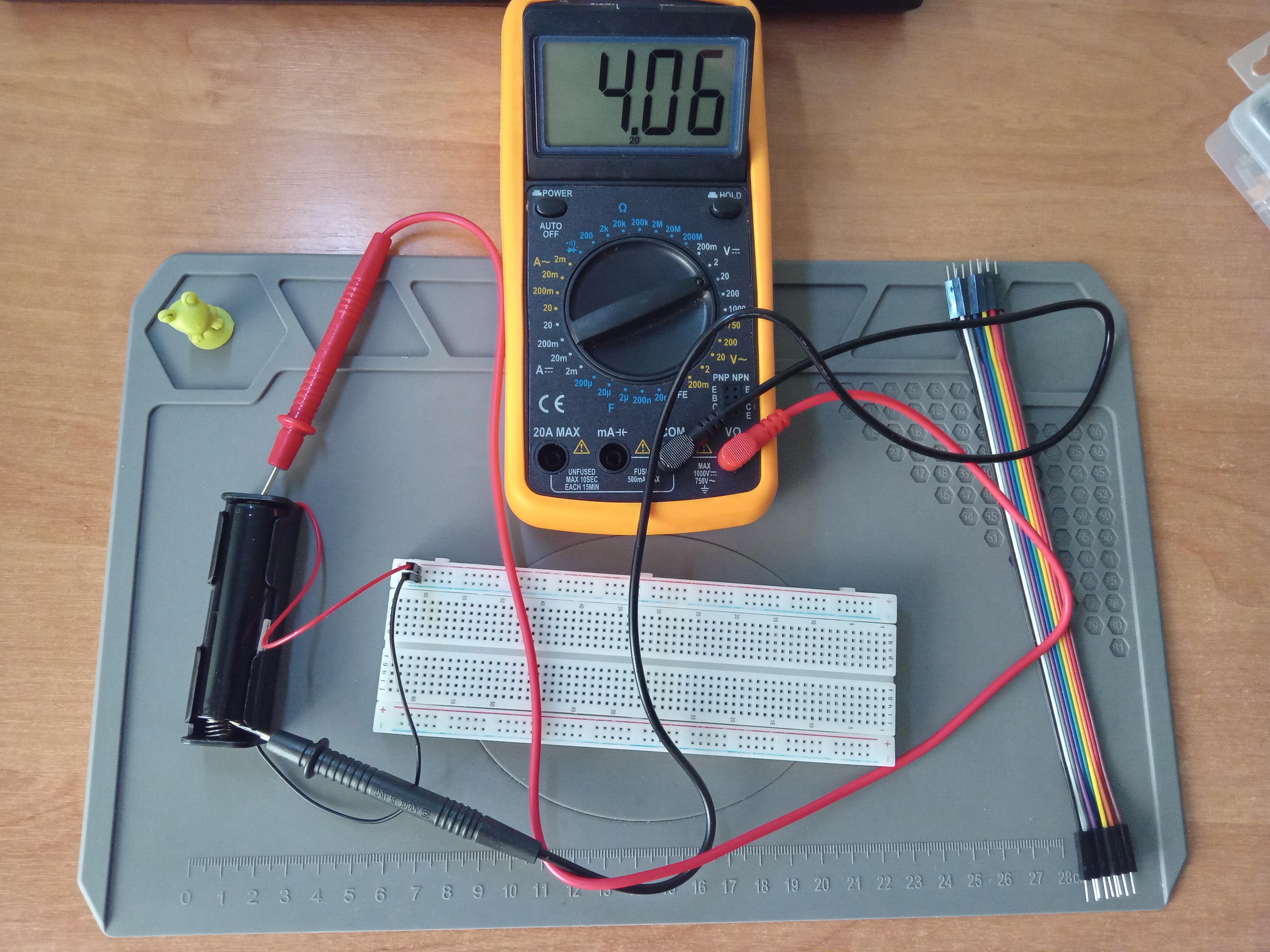 На фото зверху видно що напруга живлення буде 4,06В і це дещо забагато. Характеристики моїх світлодіодів я не маю, тому спочатку вирішив підібрати резистори під кожен світлодіод. Для початку беремо резистор високого опору - з запасом, думаю 100кОм вистачить, і збираємо такий ланцюжок: