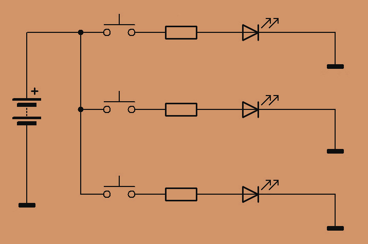 Це дуже просто зробити - три паралельно заживлені гілки, на кожній з них послідовно з'єднуються кнопка->резистор->світлодіод. Резистори потрібні для гасіння напруги у випадку якщо напруга живлення вища за номінальну напругу світлодіода. Виходить ось така проста схема: