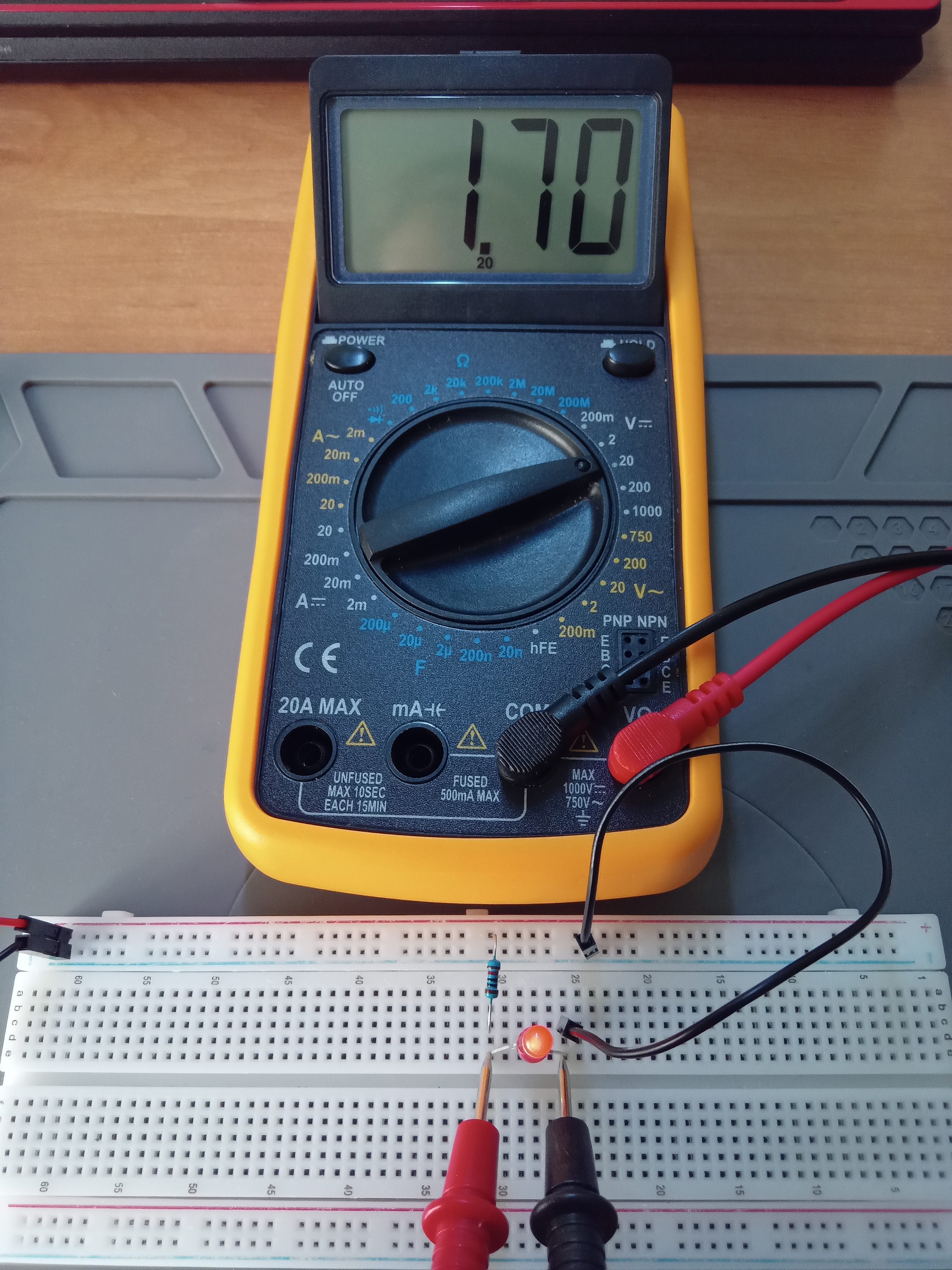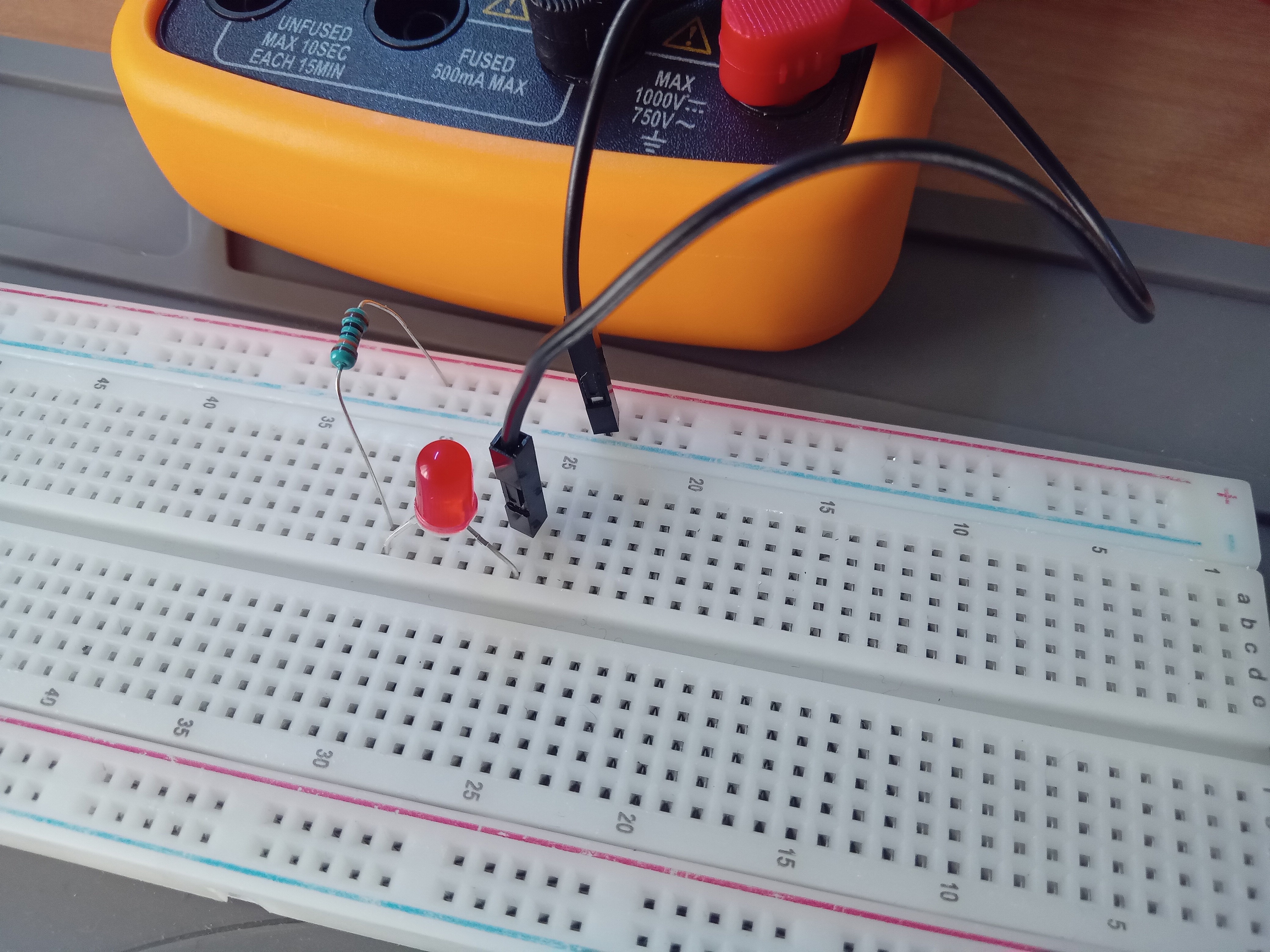 Тут резистор підключено від плюса живлення до аноду(+) діода (нагадаю, що у анода світлодіода ніжка довша). Далі катод діода через дріт з пінами підключений до мінуса живлення. На фото видно, що світлодіод майже не світиться - опір резистора занадто великий. Пробую резистор в 10кОм: