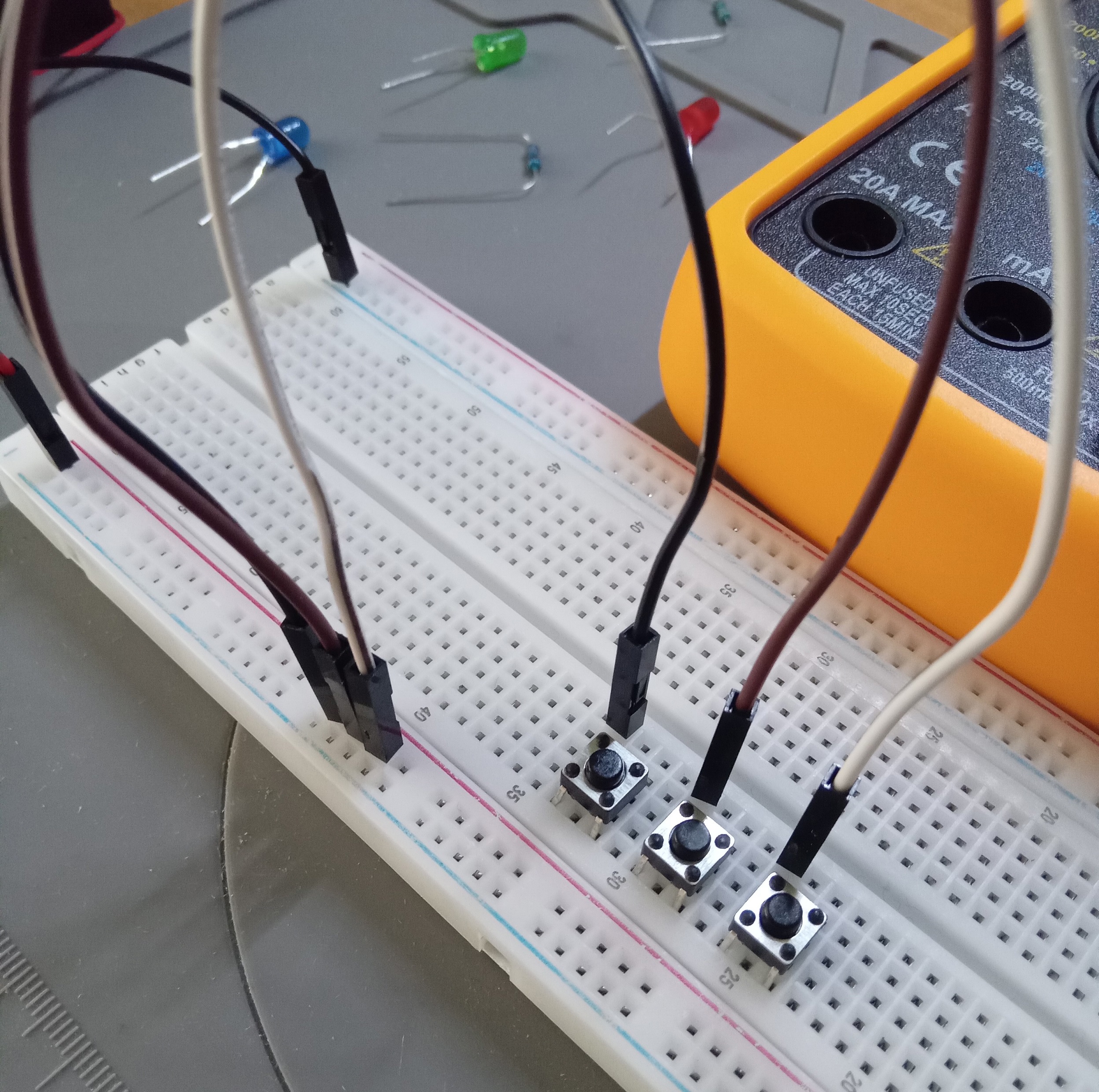 Задача: зібрати схему з трьома світлодіодами різних кольорів і трьома кнопками на кожен. При натисканні кнопки відповідний діод світиться, при відпусканні - гасне.