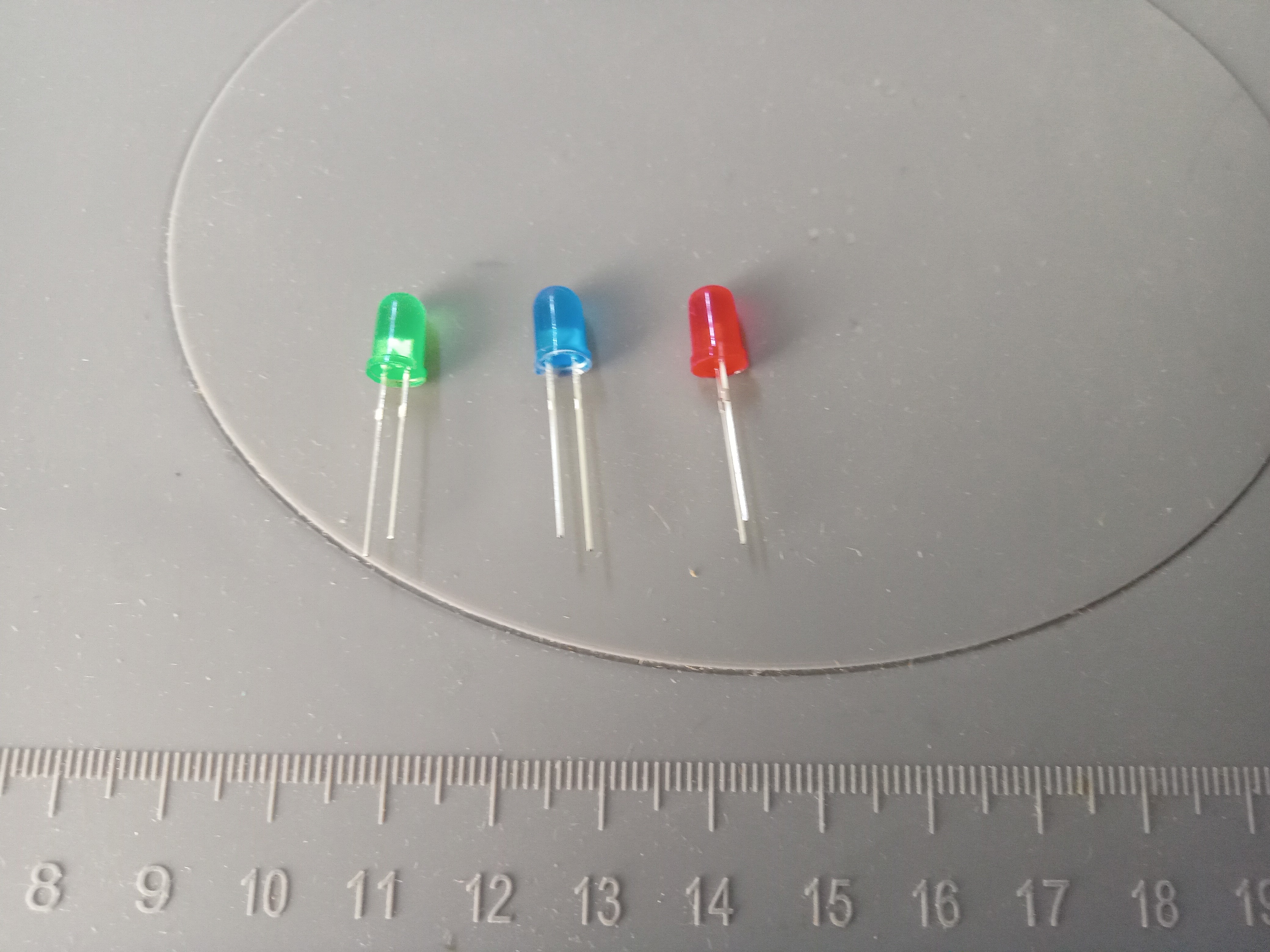 Резистори в схемі будуть різних номіналів, так як діоди різного кольору мають різну робочу напругу - така особливість. Маю такі світлодіоди, але можна використовувати інші:
